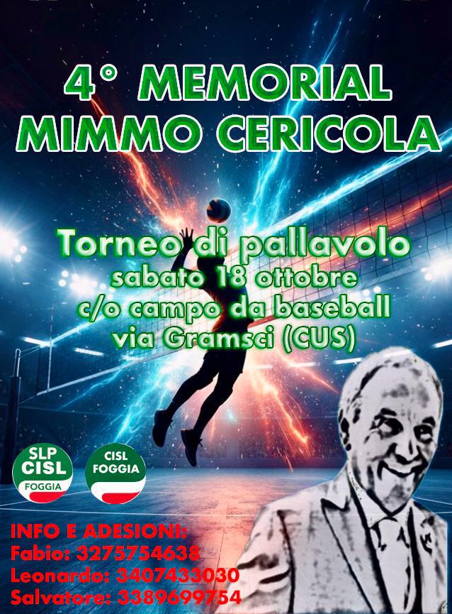IV Memorial Mimmo Cericola: Torneo di Pallavolo. Sabato 18 ottobre 2025, ore 17:00 presso il Campo da Baseball sito in Via Antonio Gramsci – Foggia. Si raccolgono le adesioni per partecipare al torneo entro il 17 ottobre‼ Vi aspettiamo numerosi. [ leggi