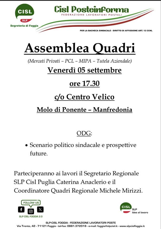 Venerdì 5 settembre, presso il Centro Velico di Manfredonia, si è svolta l’’Assemblea Territoriale Quadri organizzata da SLP CISL, un importante momento di confronto e condivisione tra i rappresentanti dei settori PCL e MP. [ leggi