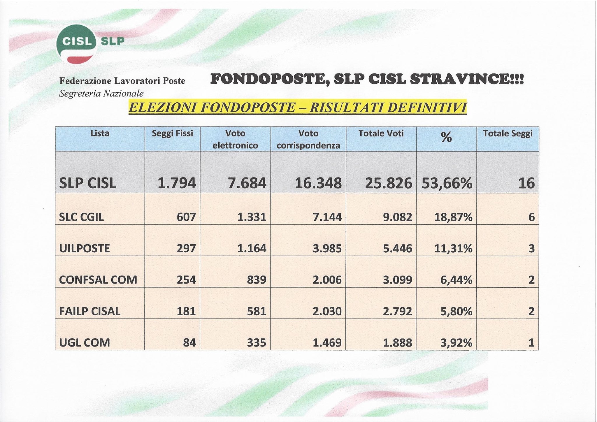 I risultati elettorali evidenziano una straordinaria affermazione della lista SLP CISL che, raccogliendo il 53,66% dei consensi, si è aggiudicata ben 16 seggi sui 30 disponibili, migliorando del 2% e di 1 seggio rispetto alla precedente tornata elettorale del 2010.