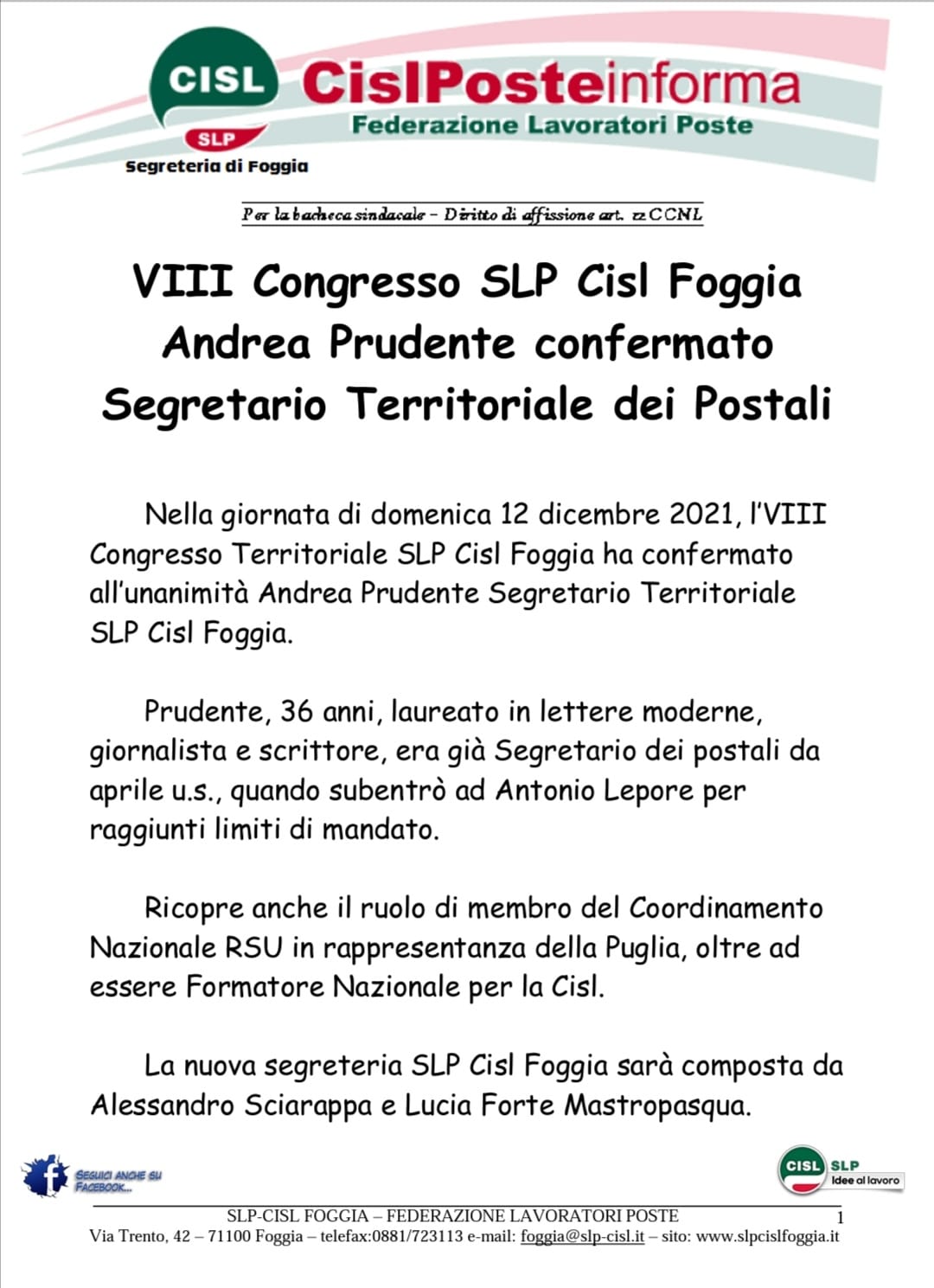 La lettera del neo segretario SLP Cisl Foggia ai lavoratori postali di Capitanata.