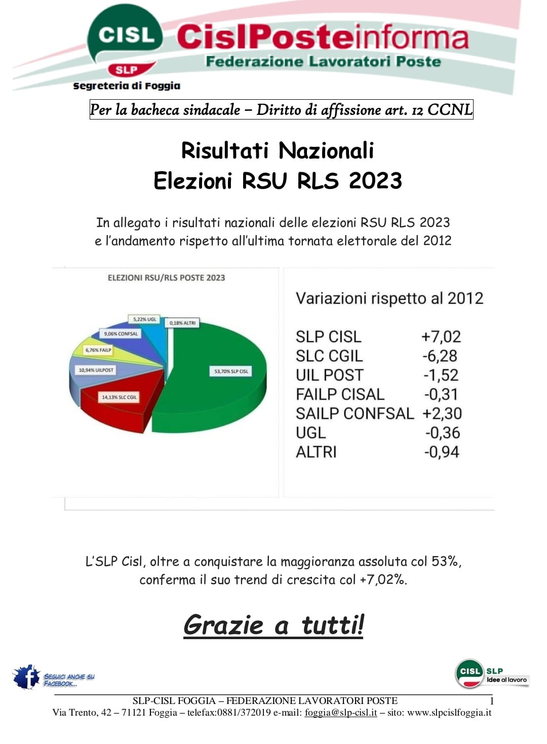 Dato Nazionale Elezioni RSU 2023: SLP-CISL STRAVINCE