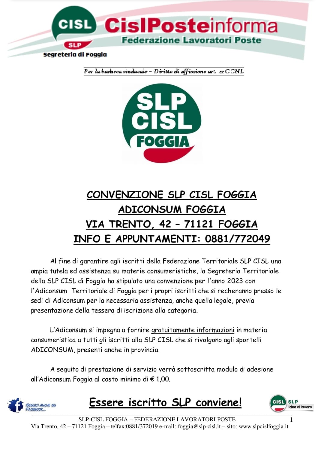 Le Convenzioni SLP CISL FOGGIA offrono servizi anche ai familiari dei propri iscritti convenzioni stipulate con aziende e negozi ...