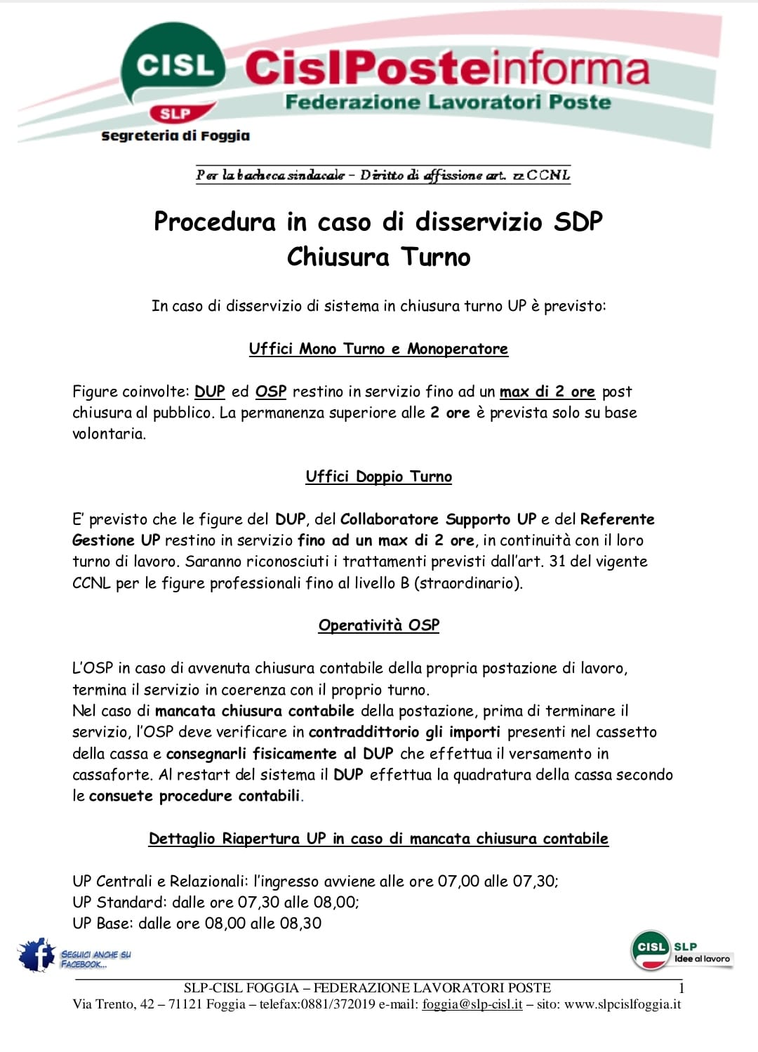 Procedura in caso di disservizio SDP: Chiusura ufficio
