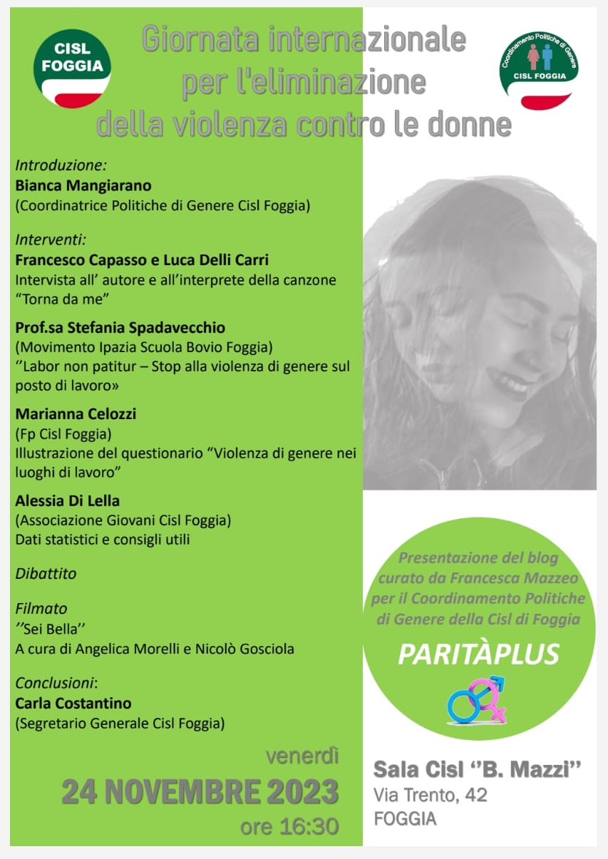24 Novembre 2023 Giornata internazionale per l'eliminazione della violenza sulle donne Il 24 NOVEMBRE 2023 alle ore 16:30 presso la Sala Cisl ‘’B. Mazzi’’ in Via Trento, 42 a FOGGIA si terrà in occasione della Giornata internazionale per l'eliminazione della violenza sulle donne il dibattito con il seguente programma: