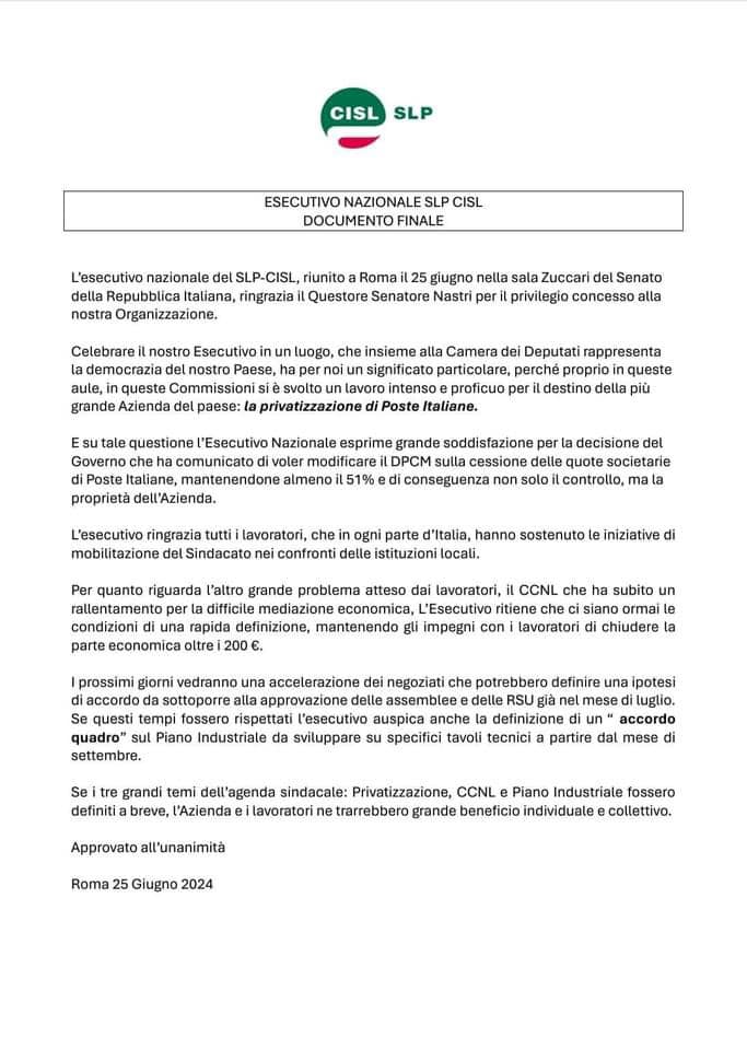 Ieri presso la Sala Zuccari del Senato della Repubblica in Roma si è svolto un Convegno con un focus specifico sul futuro assetto societario di Poste Italiane, sul Piano Industriale e sullo stato delle trattative per il rinnovo del CCNL.