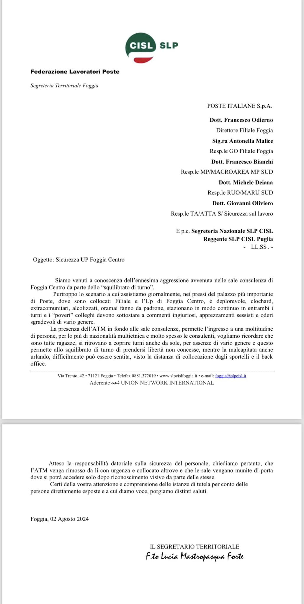 Purtroppo lo scenario a cui assistiamo giornalmente, nei pressi del palazzo più importante di Poste, dove sono collocati Filiale e l’Up di Foggia Centro, ê deplorevole, clochard, extracomunitari, alcolizzati, oramai fanno da padrone. stazionano in modo continuo in entrambi i turni e i “poveri” colleghi devono sottostare a commenti ingiuriosi, apprezzamenti sessisti e odori sgradevoli di vario genere.