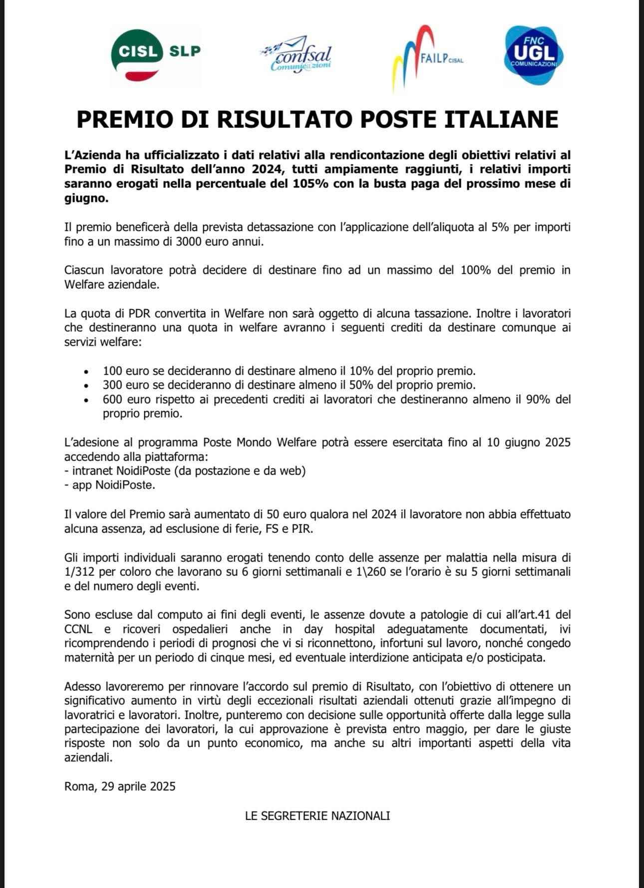 Nel complesso si esprime soddisfazione per l’intesa siglata, avendo ottenuto il più rappresentativo incremento economico mai raggiunto dai precedenti rinnovi sul Premio di Risultato, quale giusto riconoscimento all’impegno dei lavoratori nel raggiungimento degli obiettivi di Poste Italiane, nell’ambito della validità del confronto, della contrattazione e della partecipazione attiva.