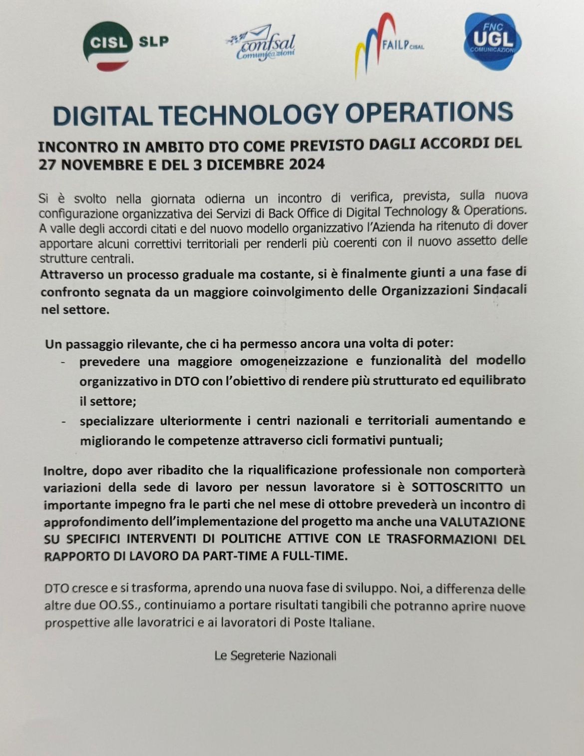DTO cresce e si trasforma, aprendo una nuova fase di sviluppo. Noi, a differenza delle altre due 00.55., continu iamo a portare risultati tangibili che potranno aprire nuove prospettive alle lavoratrici e ai lavoratori di Poste Italiane.