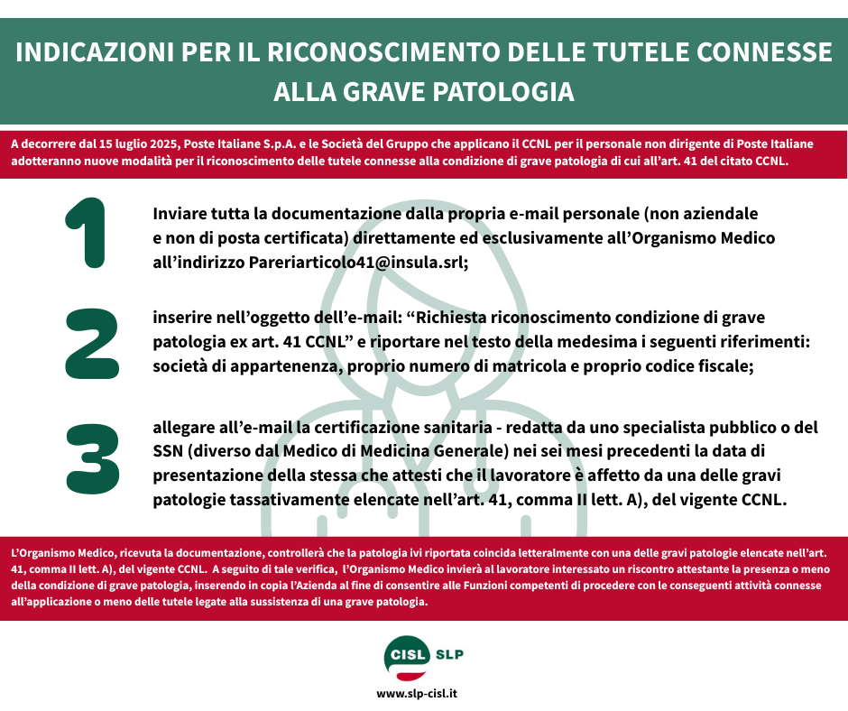 Si comunica che, a decorrere dal 15 luglio 2025, Poste Italiane S.p.A. e le Società del Gruppo che applicano il CCNL per il personale non dirigente di Poste Italiane adotteranno nuove modalità per il riconoscimento delle tutele connesse alla condizione di grave patologia di cui all’art. 41 del citato CCNL. Nello specifico, i lavoratori che si trovino in una delle condizioni di cui all’art. 41, comma II lett. A), del vigente CCNL e che intendano avvalersi delle tutele connesse alla grave patologia dovranno inviare la relativa certificazione direttamente a un Organismo Medico terzo (Medico Incaricato), a tal fine individuato dal datore di lavoro, seguendo le indicazioni riportate nel presente Comunicato. Pertanto, quanto di seguito riportato sostituisce integralmente le indicazioni contenute nel paragrafo “Riconoscimento della grave patologia: documentazione da produrre” di cui al Comunicato al Personale del 22 ottobre 2024; restano ferme, invece, le regole concernenti il periodo di conservazione del posto di lavoro nonché le ulteriori indicazioni operative ivi contenute.