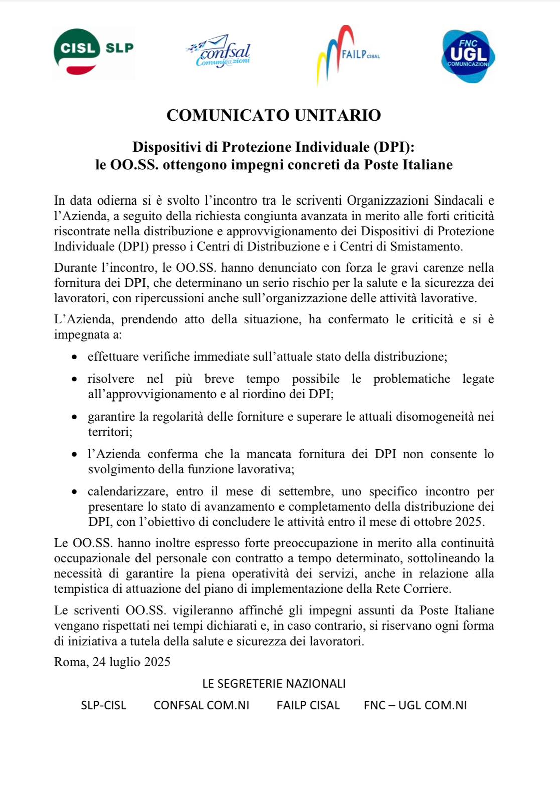 Dispositivi di Protezione individuale (DPI): le OO.SS. ottengono impegni concreti da Poste Italiane In data odierna si è svolto l’incontro tra le scriventi Organizzazioni Sindacali e l’Azienda, a seguito della richiesta congiunta avanzata in merito alle forti criticità riscontrate nella distribuzione e approvvigionamento dei Dispositivi di Protezione Individuale (DPI) presso i Centri di Distribuzione e i Centri di Smistamento.