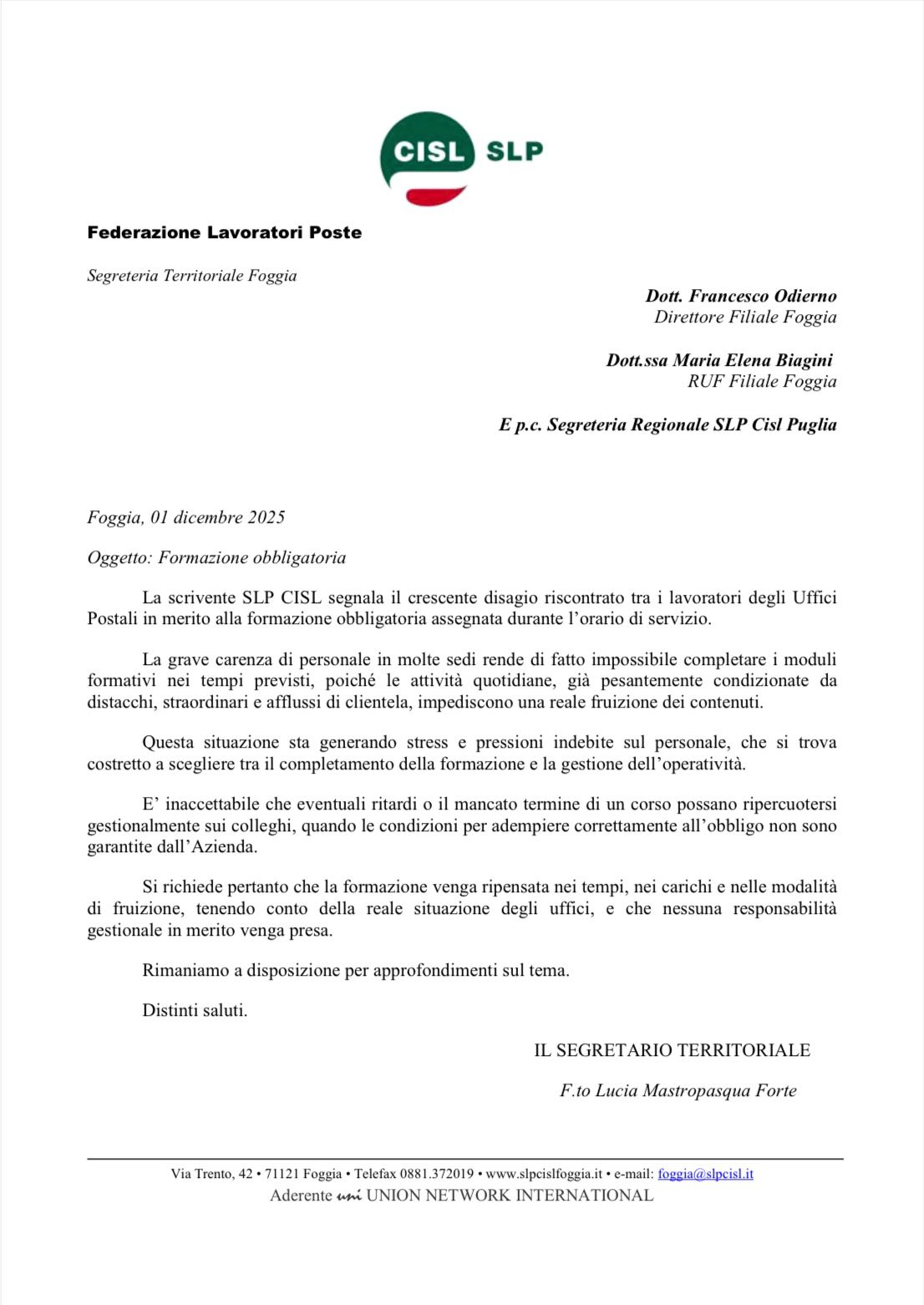 La scrivente SLP CISL segnala il crescente disagio riscontrato tra i lavoratori degli Uffici Postali in merito alla formazione obbligatoria assegnata durante l’orario di servizio.