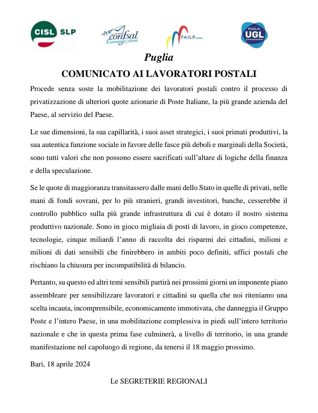 Procede senza soste la mobilitazione dei lavoratori postali contro il processo di privatizzazione di ulteriori quote azionarie di Poste ITaliane, la più grande azienda del Paese, al servizio del Paese. [
